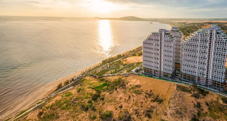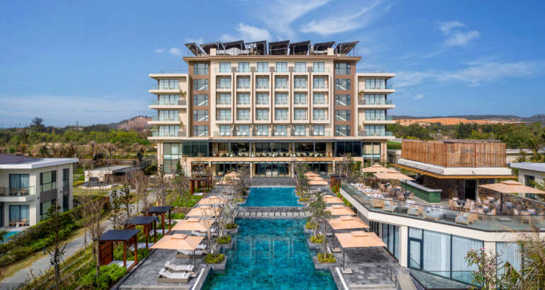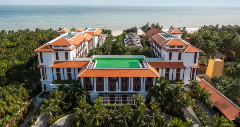 Resort 5 sao phong cách Đông Dương cổ điển, kiến trúc tinh tế, hồ bơi sát biển, dịch vụ chuẩn quốc tế, phù hợp nghỉ dưỡng cao cấp.