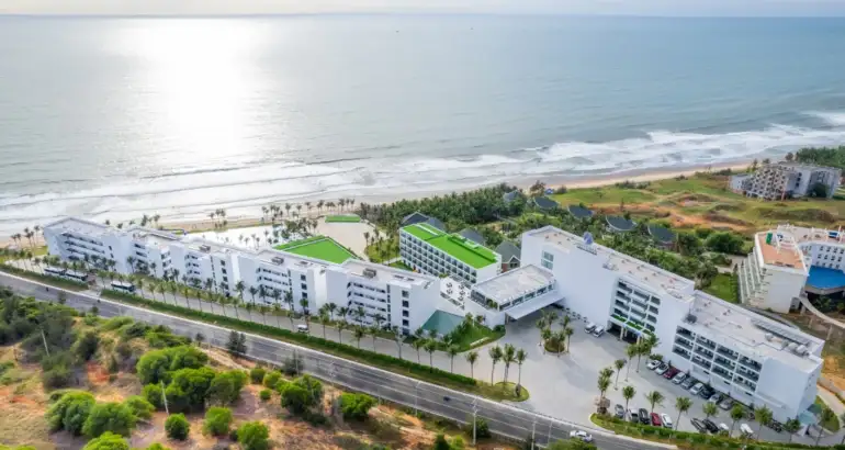 Resort 4 sao, thiết kế hiện đại, hồ bơi lớn, sát biển, phòng rộng, phù hợp nhiều nhóm khách.