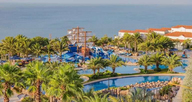 Resort lấy cảm hứng phiêu lưu, thiết kế Địa Trung Hải, phù hợp gia đình, có công viên nước, spa, nhà hàng, view biển đẹp.